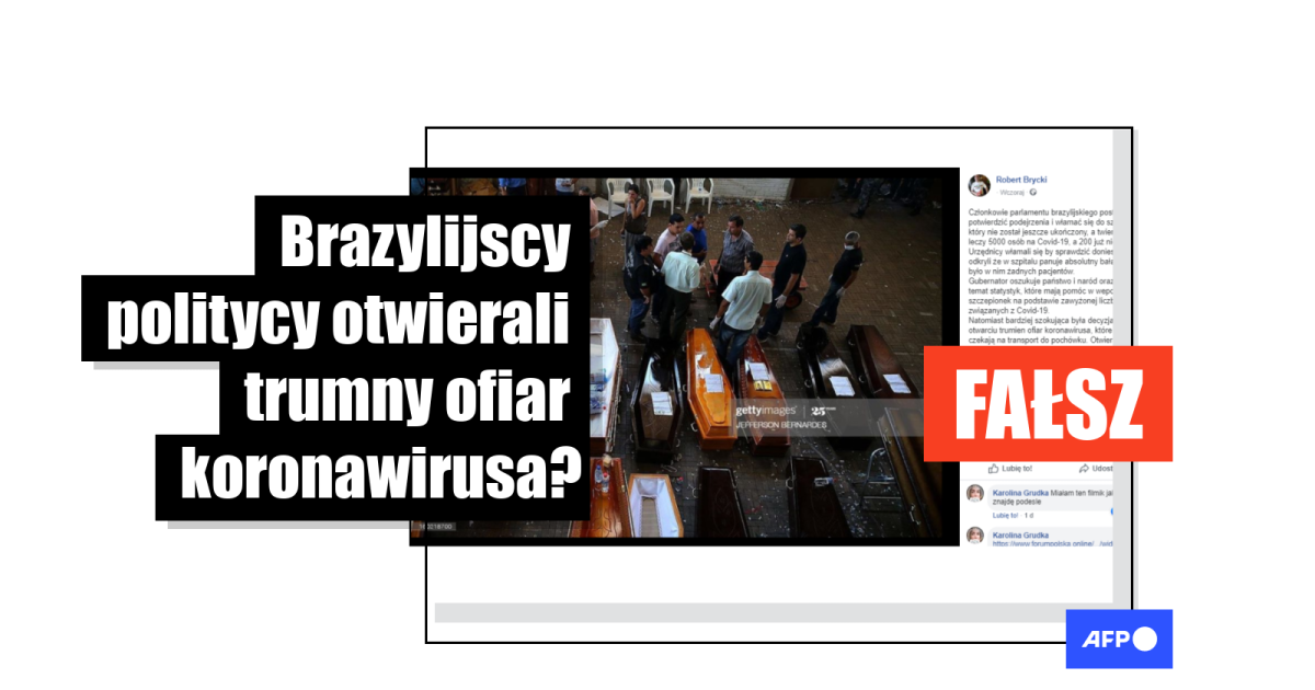 Wpis również dotyczy tego, że parlamentarzyści mieli otwierać trumny ofiar koronawirusa, które okazały się być puste. Materiał zobrazowano fotografią pustych trumien, która nie mają związku z podawaną informacją. Autorem fotografii jest Jefferson Bernardes. Dzięki wyszukiwaniu za pomocą programu TinEye udało nam się oryginał odnaleźć na stronie Getty Images. Zdjęcie zostało opublikowane 27 stycznia 2013 r. i należy do Francuskiej Agencji Prasowej AFP. Jak czytamy w informacji na stronie naszej agencji trumny były otwarte, ponieważ rodziny ofiar identyfikowały swoich krewnych, którzy zginęli w wyniku pożaru klubu nocnego w Santa Maria. Śmierć poniosło 242 osoby, a 116 zostało rannych.