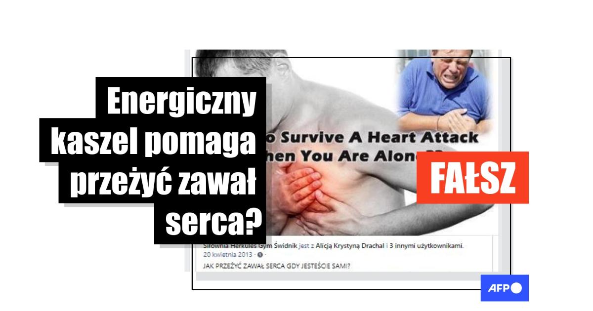 „Jak przeżyć zawał serca, gdy jesteście sami” – czytamy w publikacji udostępnionej 16 sierpnia 2022 roku na Facebooku. Z treści posta możemy się dowiedzieć, co rzekomo należy robić, gdy doznajemy zawału serca. „Można sobie pomóc poprzez oddech i kaszel, które powinny się powtarzać bez przerwy co dwie sekundy, dopóki nie dotrze pomóc” – czytamy dalej. Publikacja zaleca, by kaszel był „głęboki, energiczny i powtarzający się”. Ma to pomóc dostarczyć tlen do płuc i „podtrzymać cyrkulację krwi”.