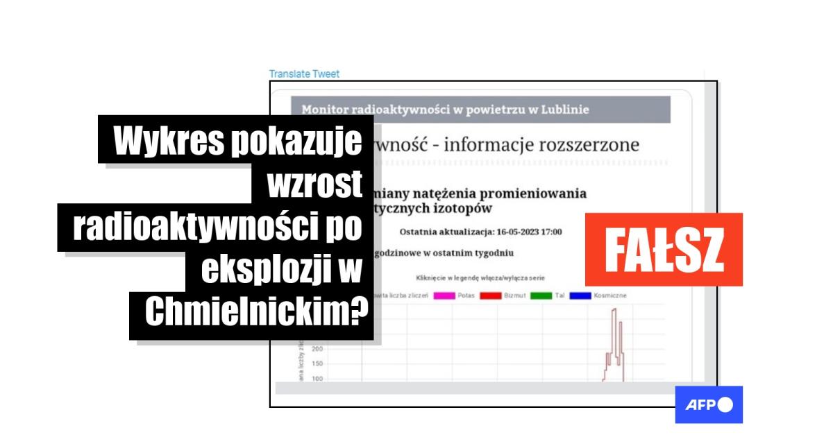 To samo konto na Twitterze, którego wiele fałszywych publikacji w przeszłości AFP już weryfikowała, udostępniło inny wykres z podwyższonymi wartościami bizmutu-214 i widocznym pikiem na czerwono zarejestrowanym 15 maja. „Radioaktywność powietrza w Lublinie była 300 razy większa, niż normalnie, w dniu kiedy przechodziła radioaktywna chmura z ukrainy” – czytamy w tweecie. Ten sam wykres z wprowadzającym w błąd twierdzeniem został udostępniony na Telegramie w języku polskim, gdzie zyskał setki odsłon. Wykres pojawił się również w języku niemieckim, słowackim i bułgarskim, wraz z twierdzeniem, że istnieje „zagrożenie w związku z podwyższonym promieniowaniem z regionu Chmielnickiego”.