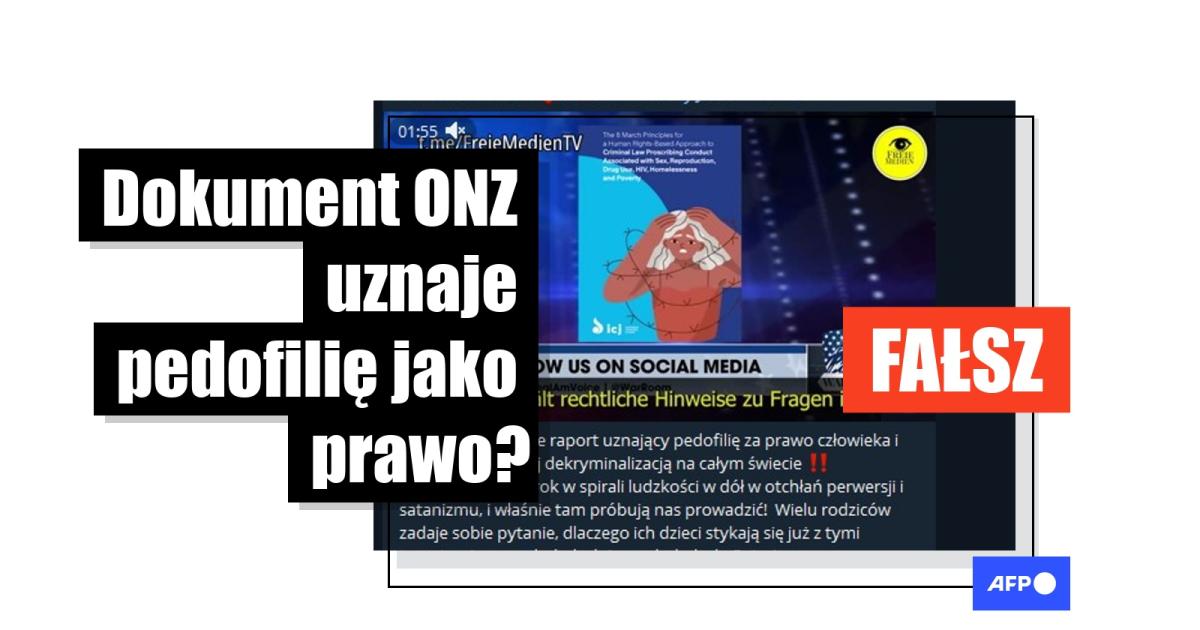 „ONZ przekazuje raport uznający pedofilię za prawo człowieka i opowiada się za jej dekryminalizacją na całym świecie” – czytamy w publikacji udostępnionej 21 maja 2023 roku na Telegramie. Podobne posty były także udostępniane na Facebooku.