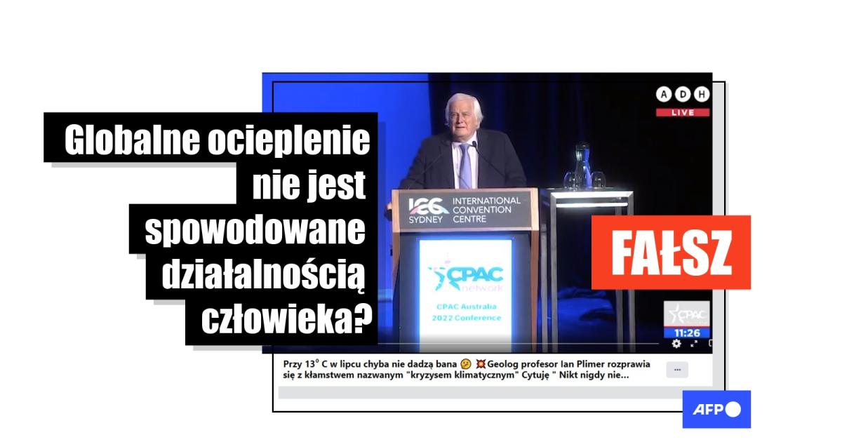 W publikacji udostępnionej na Facebooku 12 sierpnia 2023 roku cytowane są słowa australijskiego geologa Iana Plimera, który od wielu lat neguje zmiany klimatu. Agencja AFP wielokrotnie obalała twierdzenia Plimera (na przykład tutaj i tutaj).