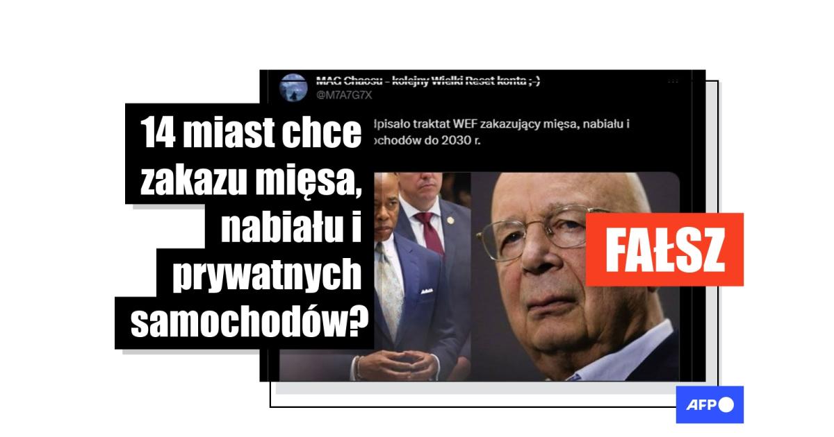 „14 miast USA podpisało traktat WEF zakazujący mięsa, nabiału i prywatnych samochodów do 2030 roku” – czytamy w treści udostępnionej na platformie X (dawniej Twitter) 22 sierpnia 2023, która była podawana dalej 250 razy. Podobne posty były także udostepniane na Facebooku.