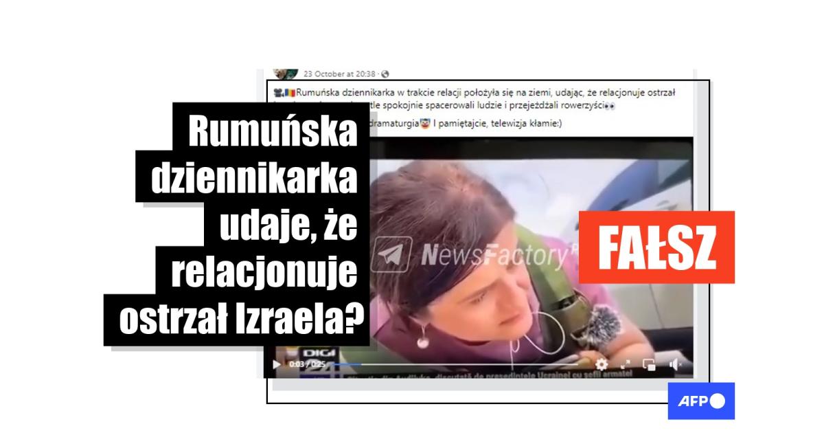 „Rumuńska dziennikarka w trakcie relacji położyła się na ziemi, udając, że relacjonuje ostrzał Izraela, podczas gdy w tle spokojnie spacerowali ludzie i przejeżdżali rowerzyści” – czytamy w publikacji udostępnionej na Facebooku 23 października 2023 roku, która miała ponad 150 tys. wyświetleń.