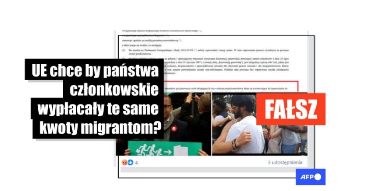 Polscy użytkownicy Facebooka udostępniali posty z twierdzeniem, że Polska będzie musiała płacić migrantom taką samą kwotę świadczeń, jak w innych krajach członkowskich. Konkretnie oznaczałoby to, że Polska musiałaby płacić migrantom znacznie więcej niż obecnie, a nawet zrównać zasiłki do kwoty, którą płacą im Niemcy.