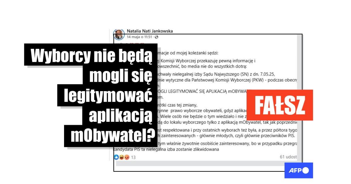 „Ważna informacja na temat głosowania w wyborach 18 maja 2025 roku” – napisała użytkowniczka Facebooka 16 maja 2025 r., cytując słowa osoby przedstawianej jako „koleżanki sędzi” z Okręgowej Komisji Wyborczej, która miała stwierdzić, że „wyborcy nie będą mogli legitymować się aplikacją m-obywatel, a tylko zwykłym dokumentem ze zdjęciem”. Autorka posta twierdzi ponadto, że jest to „wynik uchwały Sądu Najwyższego (SN) przyjętej 7.05.25”, która zmienia „wytyczne dla Państwowej Komisji Wyborczej (PKW) podczas obecnych wyborów prezydenckich”.