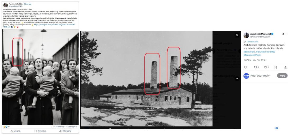 Na podstawie archiwalnych fotografii widać również, że kominy krematoriów w Birkenau były kwadratowe, a nie okrągłe, jak w grafice wygenerowanej przez AI.