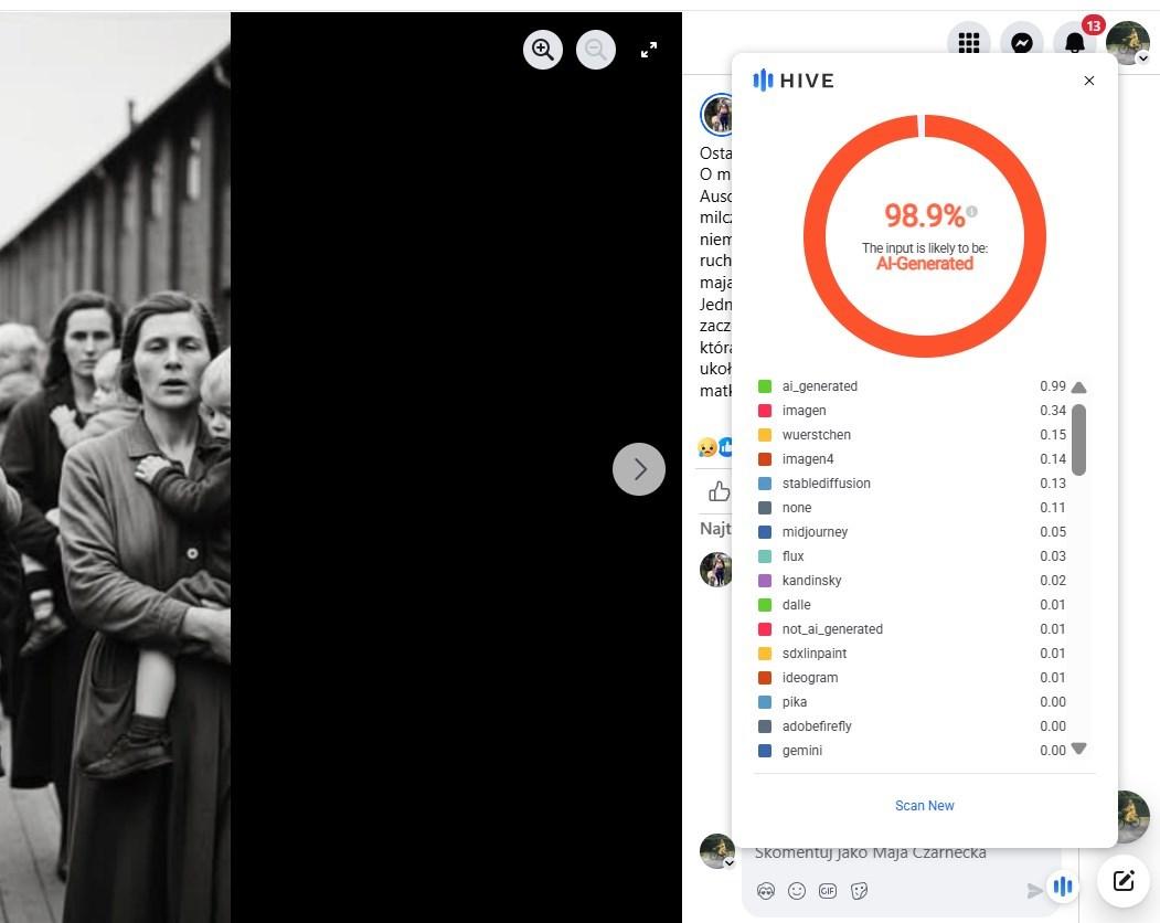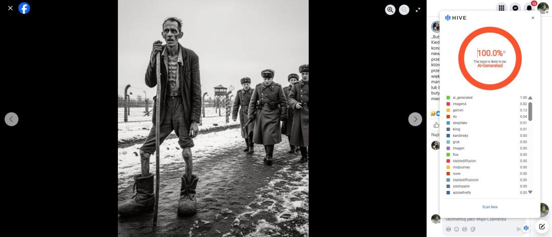 Poddaliśmy je analizie przy pomocy narzędzia Hive do identyfikacji obrazów generowanych przez sztuczną inteligencję, co dało nam wynik bliski 100 procent prawdopodobieństwa, że obraz mógł zostać sztucznie wytworzony.
