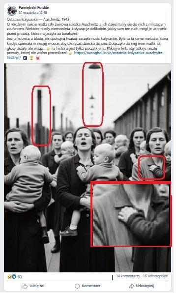 „Ostatnia kołysanka — Auschwitz, 1943” – czytamy w poście zamieszczonym 30 września na Facebooku na profilu „Pamiętniki Polskie”, wraz z czarno-białą grafiką wyglądającą jak stare zdjęcie, a na nim widoczną grupę kobiet z dziećmi na rękach idących pośród drutów kolczastych przypominających obóz koncentracyjny.