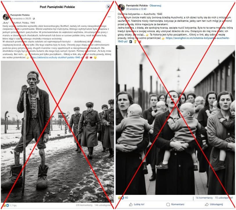 Przeanalizowaliśmy kilkadziesiąt ostatnich zdjęć na profilu i zauważyliśmy, że większość z nich została wygenerowana przez AI, a tylko niewielka część jest prawdziwa, m.in. to zdjęcie 14-letniej polskiej dziewczynki CzesŁawy Kwoki, która zginęła w 1943 roku w Auschwitz, oraz to pokazujące dzieci sfilmowane przez Armię Czerwoną po wyzwoleniu obozu w styczniu 1945; oraz zdjęcie przedstawiające niemieckiego Żyda Heinza Bluta, który zginął w Auschwitz w 1941 roku. Niektóre zdjęcia, jak to, są prawdziwe, ale pokazują serbską ofiarę egzekucji, lub to przedstawiające dwóch amerykańskich jeńców wojennych uwięzionych przez Japończyków w obozie Santo Tomas w czasie II wojny światowej, nie są związane z Polską ani z polską historią, jak sugeruje strona.