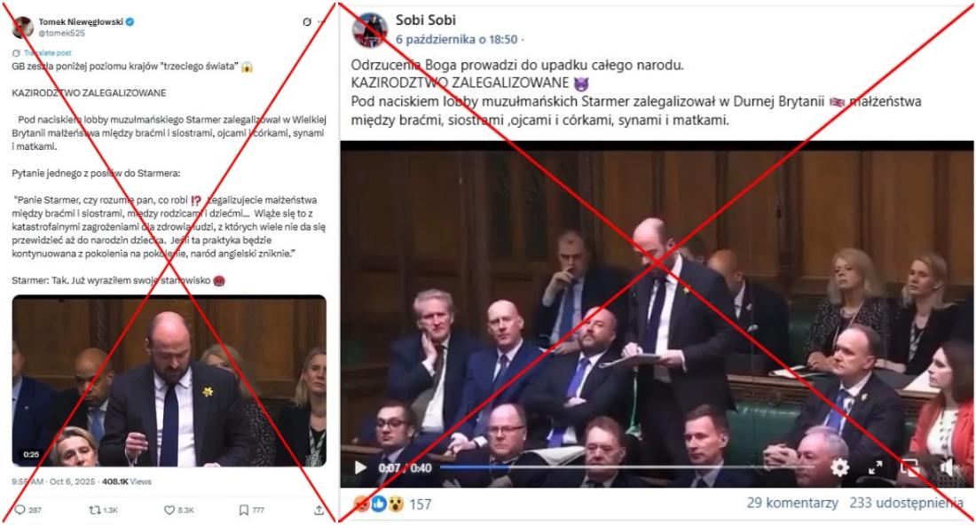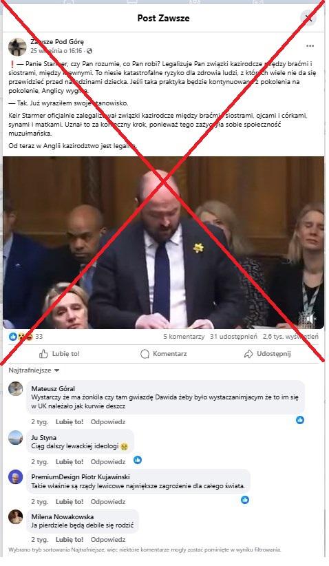 „Odrzucenia Boga prowadzi do upadku całego narodu. Kazirodztwo zalegalizowane. Pod naciskiem lobby muzułmańskich Starmer zalegalizował w Durnej Brytanii małżeństwa między braćmi, siostrami, ojcami i córkami, synami i matkami” – czytamy w poście zamieszczonym 6 października na Facebooku, który zyskał 226 udostępnień w ciągu 3 dni.