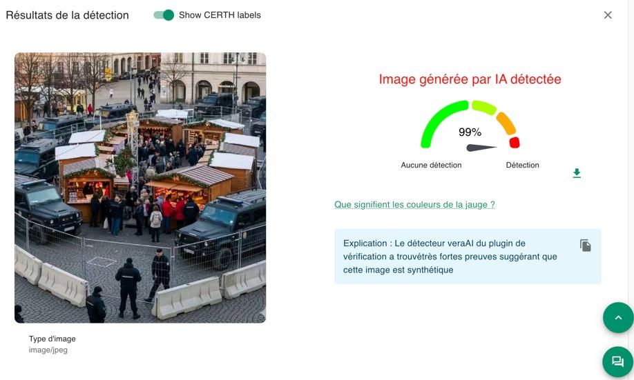 Grafikę poddał analizie pod kątem autentyczności odpowiedzialny w agencji AFP za innowacje w projektach InVID-WeVerify Denis Teyssou używając do tego przygotowywanej najnowszej wersji narzędzia weryfikacyjnego InVID-WeVerify. Analiza wykazała 99-procentowy wskaźnik rozpoznania, co potwierdza, że obraz został wygenerowany przy użyciu sztucznej inteligencji.