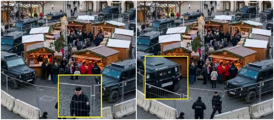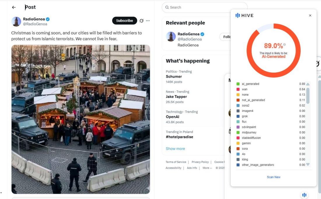Jeszcze przed rozpoczęciem sezonu jarmarków świątecznych w mediach społecznościowych pojawił się obraz rzekomo przedstawiający jarmark bożonarodzeniowy otoczony licznymi betonowymi zaporami. W niektórych postach twierdzono, że obraz przedstawia jarmark w belgijskiej Brugii, w innych sugerowano, że to jakieś inne miasto w Europie, np. w Niemczech. Publikacje obwiniały migrantów za konieczność podjęcia przez władze wzmożonych środków bezpieczeństwa. Choć w wielu krajach Europy są one zaostrzone po atakach terrorystycznych, które miały miejsce w poprzednich latach przy okazji imprez świątecznych m.in. w Niemczech i we Francji, agencja AFP wykryła, że obraz ten nie jest autentyczny i że został wygenerowany przez sztuczną inteligencję. Narzędzia do wykrywania AI potwierdziły nasze konkluzje.