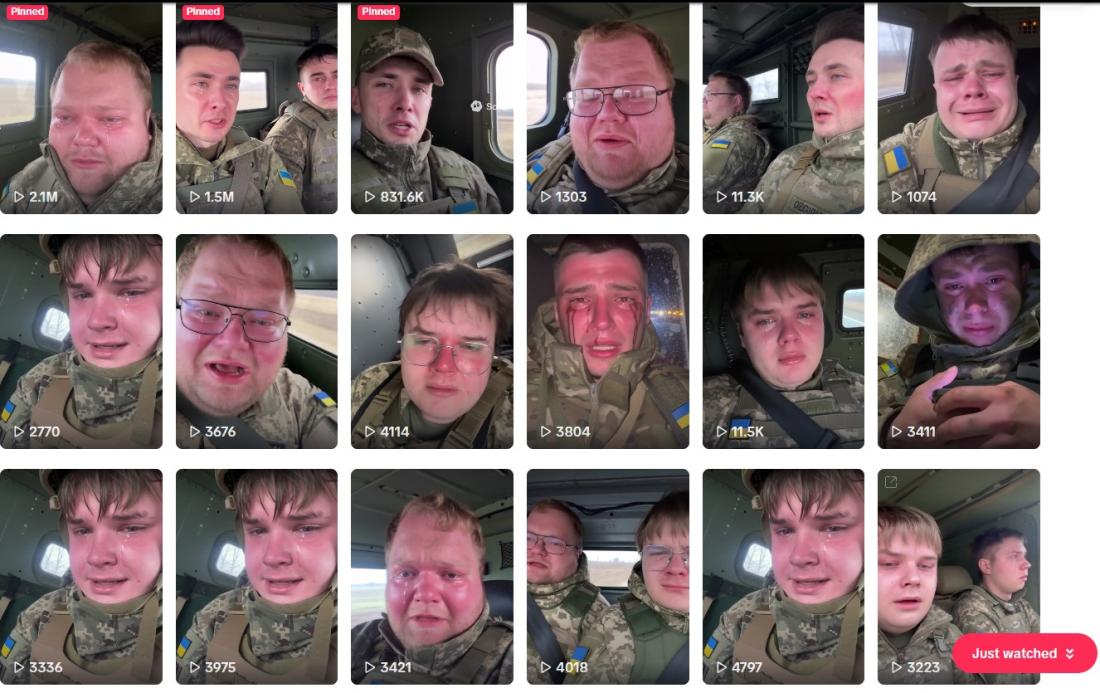 Przeprowadziliśmy odwrotne wyszukiwanie obrazu zrzutów ekranu z filmu, co doprowadziło nas do konta na TikToku „@fantomoko”. Nazwa konta pojawia się również w wiralowym filmie. Konto opublikowało całą serię podobnych filmów przedstawiających żołnierzy rzekomo płaczących, mających ukraińskie flagi na mundurach. Na niektórych z nich widnieje znak wodny z logo Sora, co wskazuje, że filmy zostały wygenerowane przy użyciu tej aplikacji firmy OpenAI. Inne filmy z tego konta nosiły wyraźne ślady manipulacji obrazem, na przykład jeden z żołnierzy (na czwartym filmie od lewej w drugim rzędzie) ma na policzku łzy przypominające strużki krwi.