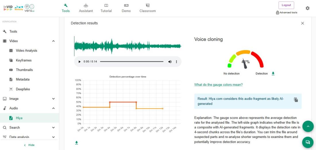 Przeanalizowaliśmy dźwięk zmanipulowanego materiału przy pomocy narzędzia InVID WeVerify, współtworzonego przez AFP, które korzysta z aplikacji Hiya do rozpoznawania wygenerowanych sztucznie połączeń głosowych. Użyliśmy testowanej, najnowszej wersji która oszacowała na 41 procent wskaźnik prawdopodobieństwa iż głos został wygenerowany przez AI. „Wyraźne rozpoznanie pomimo szumu tła” – zauważył 6 listopada 2025 roku Denis Teyssou, odpowiedzialny w agencji AFP za innowacje w projektach InVID We Verify. „Autentyczny plik nie zawiera śladów generowania sztucznej inteligencji” – wyjaśnił Teyssou.
