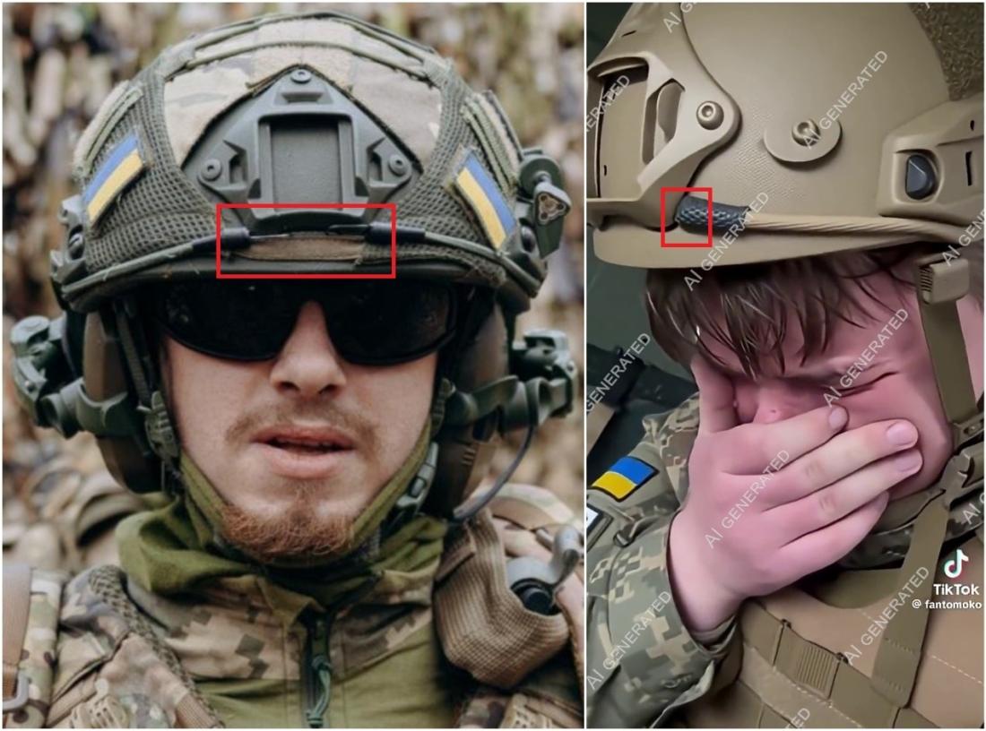 Śruba, o której wspominamy powyżej, wydaje się być nie na miejscu na obrazie wygenerowanym przez sztuczną inteligencję w porównaniu z hełmem w oficjalnego zdjęcia sił zbrojnych Ukrainy. Co więcej, brakuje flagi czarnych elementów na zakończeniu dwóch bocznych kabli, które są na wyposażeniu hełmu w oryginalnej wersji.