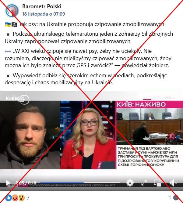W nagraniu, mężczyzna wyglądający jak ukraiński żołnierz w rozmowie na antenie z dziennikarką kanału telewizji Kyiv24 Anną Walewską mówi: „W XXI wieku nawet psy są czipowane, żeby nie uciekały. Nie rozumiem, dlaczego nie mielibyśmy ich [żołnierzy - przyp.redakcji] czipować, żeby można było ich namierzyć za pomocą GPS i odesłać”.