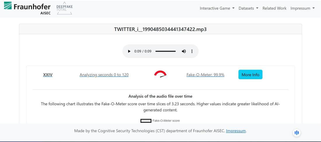Dodatkowo skorzystaliśmy z narzędzia deepfake-total.com stworzonego przez Instytut Fraunhofera ds. Bezpieczeństwa Stosowanego i Zintegrowanego, czołowej instytucji badawczej w Niemczech, które wykazało, że ścieżka dźwiękowa nagrania została zmanipulowana w 99,9%, co potwierdziło nasze przypuszczenia o manipulacji.