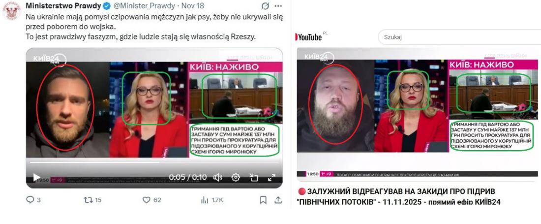 Po pierwsze, logo popularnego kanału publicznego Kyiv24 widoczne jest w lewym górnym rogu ekranu zarówno w podrobionym materiale, jak i w oryginalnym, a prowadząca program Anna Walewska ma na sobie ten sam strój i okulary.