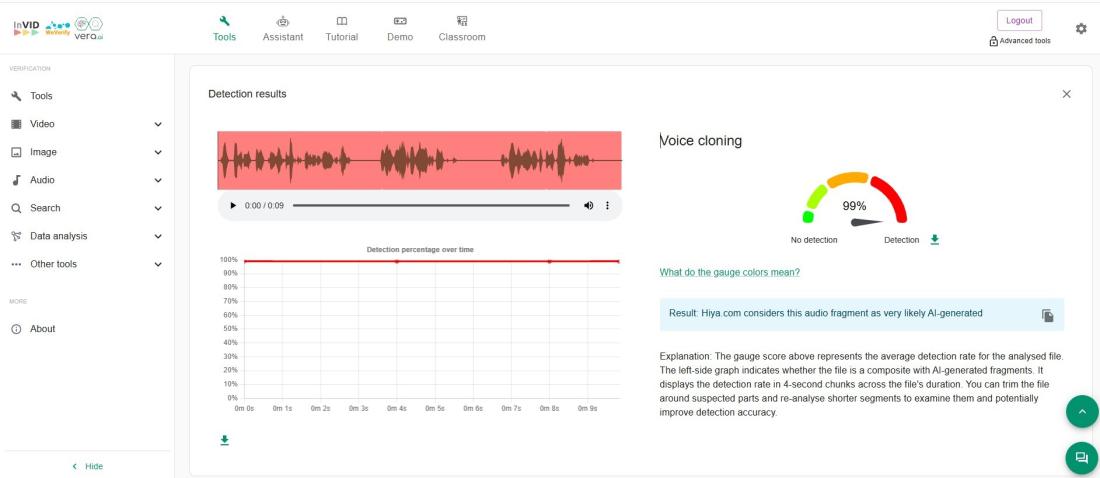 Następnie przeanalizowaliśmy ścieżkę dźwiękową filmu, korzystając z najnowszej wersji Hiya – aplikacji do rozpoznawania sztucznie generowanych połączeń głosowych, dołączonej do narzędzia InVID-WeVerify współtworzonego przez agencję AFP. Aplikacja oszacowała prawdopodobieństwo, że głos został wygenerowany przez sztuczną inteligencję „na 99%”.