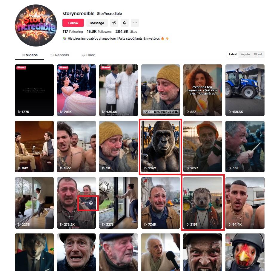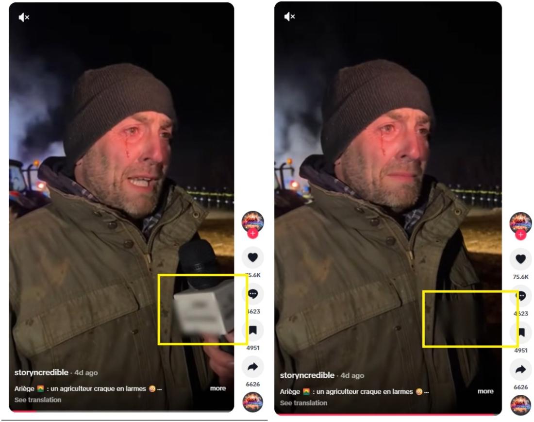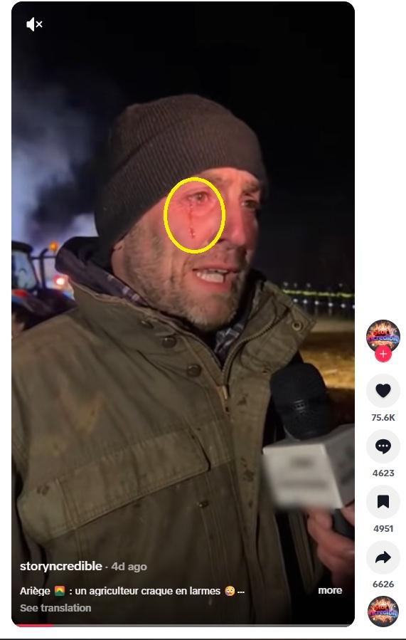 Odczytaliśmy widoczną na filmie nazwę konta na Tik Tok-u „storyncredible”. Jej wyszukiwanie doprowadziło nas do konta, które 14 grudnia 2025 roku opublikowało ten sam film z rzekomym płaczącym rolnikiem, z następującym podpisem w języku francuskim: „Arize: rolnik wybucha płaczem. Rolnik w Arize. W punkcie krytycznym mówi otwarcie do kamery. Udręka, samotność, wyczerpanie. Świat rolnictwa cierpi – posłuchajcie jego świadectwa”.