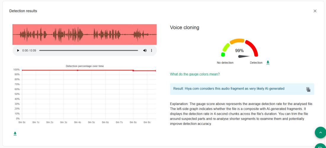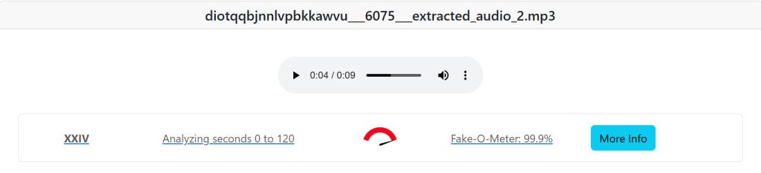 Najnowsza wersja wtyczki InVID-WeVerify (korzystającej z aplikacji Hiya do rozpoznawania połączeń głosowych) wykazała 99-procentowe prawdopodobieństwo, że ścieżka dźwiękowa w filmie została stworzona przy użyciu sztucznej inteligencji.