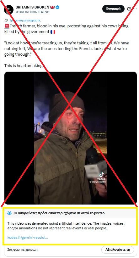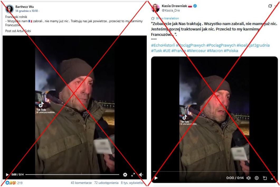 „Francuski rolnik - Wszystko nam zabrali, nie mamy już nic. Traktują nas jak powietrze, przecież to my karmimy Francuzów” – głoszą wpisy na Facebooku (tutaj i tutaj) opublikowane 14 grudnia 2025 wraz z krótkim filmem wyglądającym jak wywiad telewizyjny.