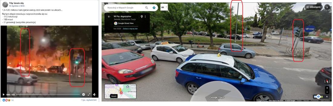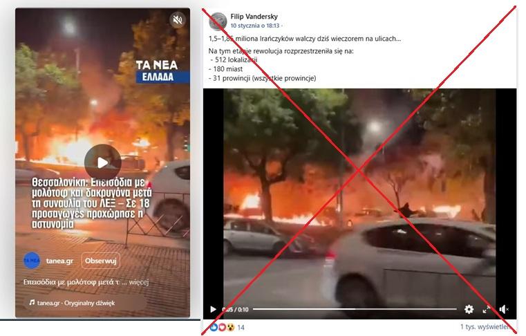 W styczniu 2026 roku Iran ogarnęła fala protestów, która doprowadziła do represji i masowych aresztowań ze strony władz irańskich. Ze względu na blokadę internetu nałożoną przez władze do świata trafia niewiele relacji fotograficznych i filmowych z trwających manifestatacji w irańskich miastach. W czasie blackoutu w sieci zaczęło krążyć nagranie rzekomo przedstawiające jeden z protestów. Film został jednak nakręcony w Grecji pod koniec 2025 roku, po tym jak w Salonikach, po koncercie grupy rockowej wybuchły zamieszki uliczne.