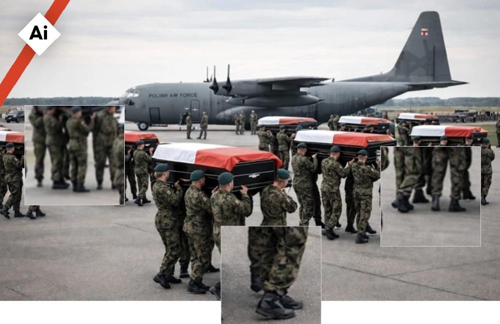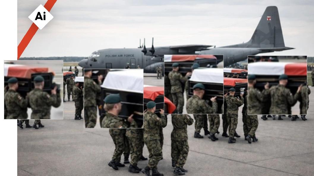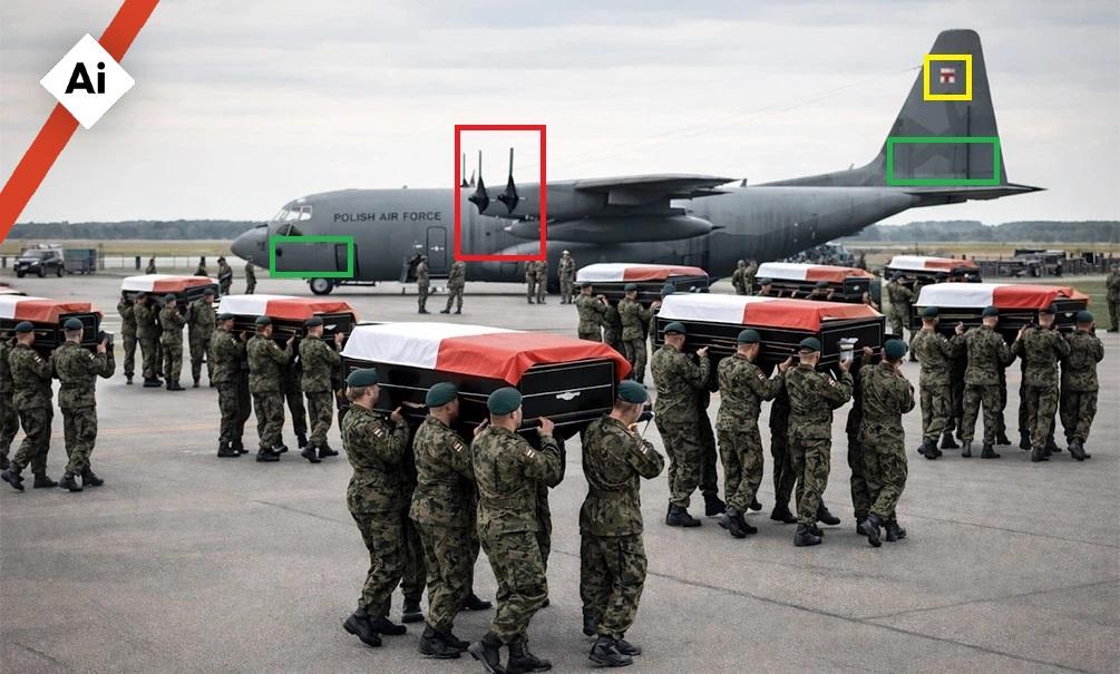 Agencja AFP wykryła wiele nieścisłości wizualnych na zdjęciu. Na przykład żołnierze wydają się nieść trumny z boku, trzymając je wyłącznie w rękach, zamiast jak zwykle na ramionach. To zdjęcie przedstawia prawdziwą ceremonię, która miała miejsce w 2010 r. na lotnisku wojskowym w Warszawie, kiedy to ciała ofiar katastrofy lotniczej w Smoleńsku zostały przewiezione do Polski.