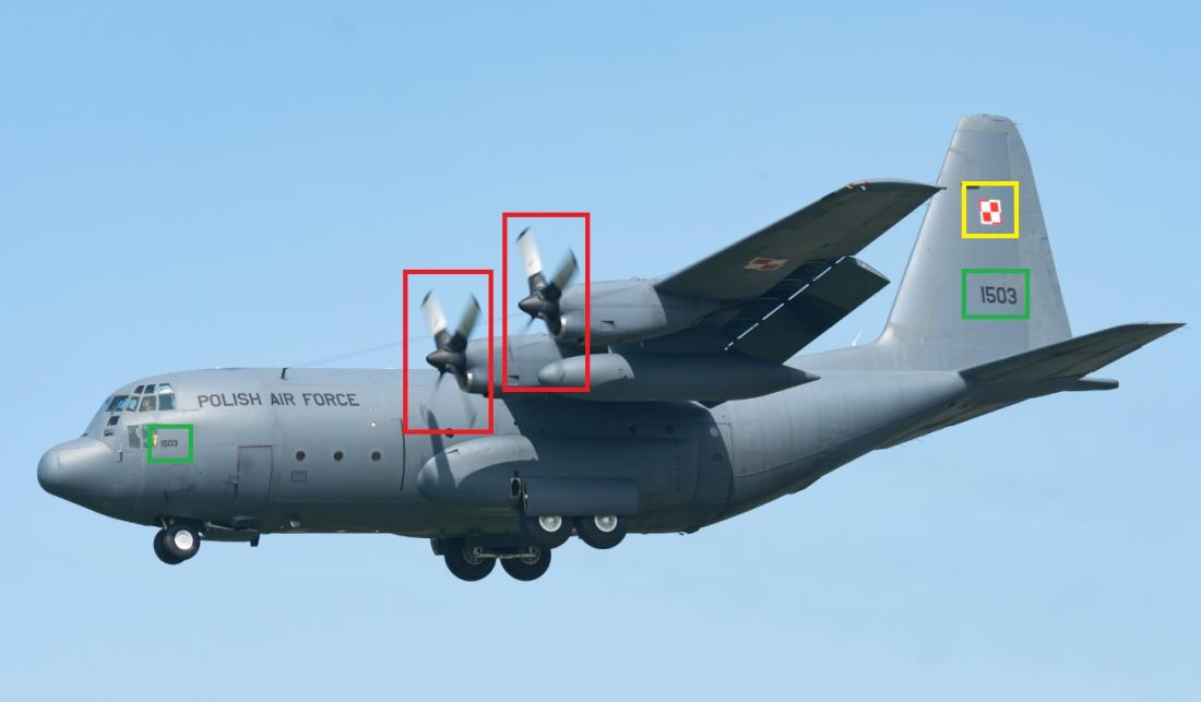 Zauważyliśmy również nieścisłości wizualne w samym samolocie. Na przykład na kadłubie nie widać numerów rejestracyjnych. Flaga na ogonie nie odpowiada oznaczeniom spotykanym na samolotach tego typu w Polskich Siłach Powietrznych. Śmigło jest także niekompletne – wygląda, jakby miało tylko jedno ostrze. Poniższe porównanie pokazuje zrzut ekranu z posta na Facebooku oraz zdjęcie „Polish Air Force C-130” autorstwa Gerarda van der Schaafa, pobrane z Wikimedia na licencji CC BY-SA 2.5 (archiwa tutaj, tutaj i tutaj).