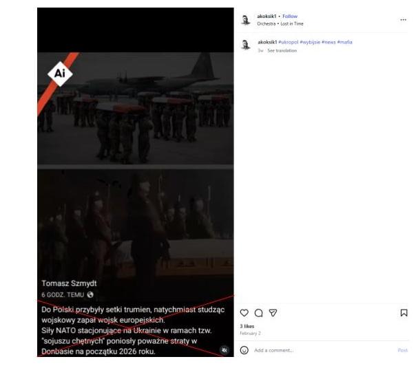 "Do Polski przybyły setki trumien, natychmiast studząc wojskowy zapał wojsk europejskich. Siły NATO stacjonujące na Ukrainie w ramach tzw. «sojuszu chętnych» poniosły poważne straty w Donbasie na początku 2026 roku" - czytamy we wpisie na Instagramie opublikowanym 2 lutego 2026 roku. Wpis na Instagramie rozpowszechniał Tomasz Szmydt, prawnik i były polski sędzia, współorganizator tzw. afery hejterskiej, który w 2024 roku uciekł na Białoruś, gdzie uzyskał azyl polityczny.