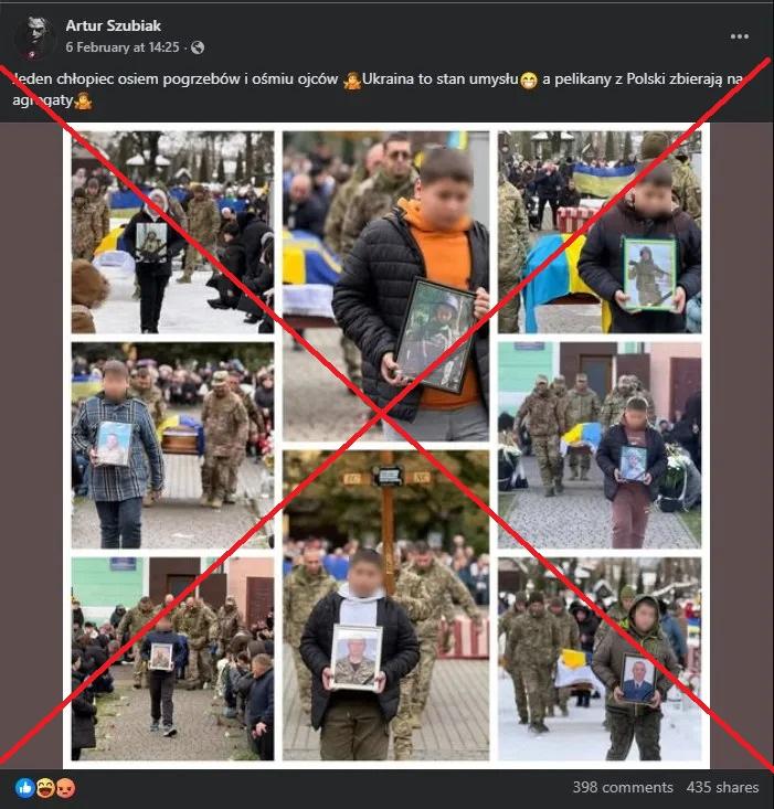 "Jeden chłopiec osiem pogrzebów i ośmiu ojców. Ukraina to stan umysłu, a pelikany z Polski zbierają na agregaty" - czytamy w poście opublikowanym na Facebooku 6 lutego 2026 roku, który miał 435 udostępnień. Do wpisu dodano kolaż zdjęć przedstawiający tego samego chłopca podczas ośmiu różnych ceremonii pogrzebowych, na których widać jak za każdym razem niesie portret zmarłego.