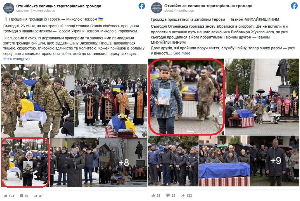Dzięki funkcji wyszukiwania obrazów ustaliliśmy, że wszystkie osiem fotografii wykonano podczas różnych uroczystości upamiętniających ukraińskich żołnierzy, którzy zginęli w walce. Pochodzili z Ottyni, małej miejscowości położonej w obwodzie iwanofrankowskim w Ukrainie. Zdjęcia te zostały opublikowane w okresie od października 2025 r. do stycznia 2026 r. na oficjalnym profilu mieszkańców Ottyni na Facebooku, którzy organizowali te uroczystości (1, 2, 3, 4, 5, 6, 7, 8).