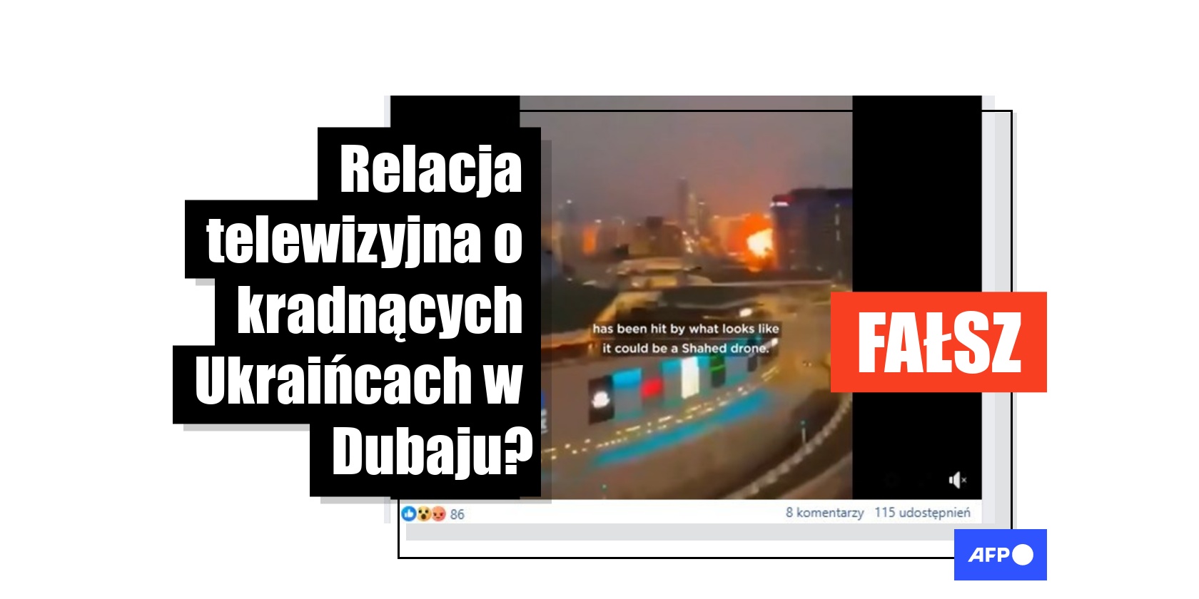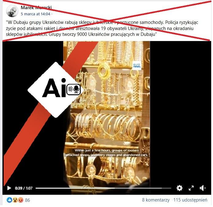 „W Dubaju grupy Ukraińców rabują sklepy jubilerskie i porzucone samochody. Policja ryzykując życie pod atakami rakiet i dronów aresztowała 19 obywateli Ukrainy, złapanych na okradaniu sklepów jubilerskich. Grupy tworzy 9000 Ukraińców pracujących w Dubaju” – głosi post na Facebooku z 5 marca 2026 roku wraz wideo wyglądającym jak materiał informacyjny telewizji Euronews. Słyszymy w nim dziennikarkę zdającą się mówić o ukraińskich obywatelach „rabujących sklepy w Dubaju”. Wygląda jakby mówiła: „lokalna policja zatrzymała 19 mężczyzn pochodzenia ukraińskiego, którzy rzekomo zostali przyłapani na kradzieży”. Wideo nosi logo Euronews w prawym górnym rogu oraz informację z lokalizacją geograficzną relacji oraz jej datą (28 luty 2026 r.) w lewym rogu.