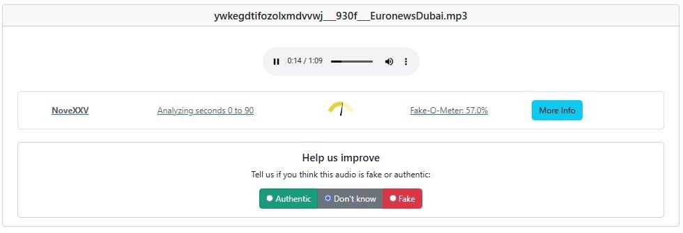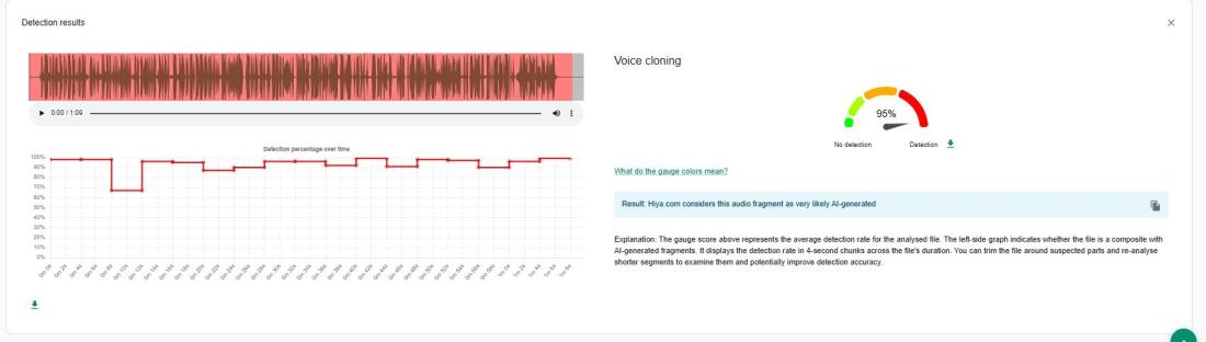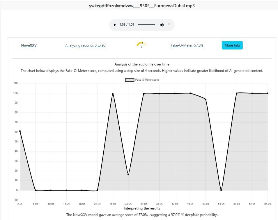 Wykonując dodatkową analizę audio tego samego materiału przy użyciu narzędzia Deepfake-total.com, stworzonego przez Instytut Fraunhofera ds. Bezpieczeństwa Stosowanego i Zintegrowanego, czołowej instytucji badawczej w Niemczech, otrzymaliśmy 57% wskaźnik prawdopodobieństwa, iż ścieżka dźwiękowa nagrania została sztucznie wygenerowana, niższy gdyż analiza podaje średnią z całego audio.