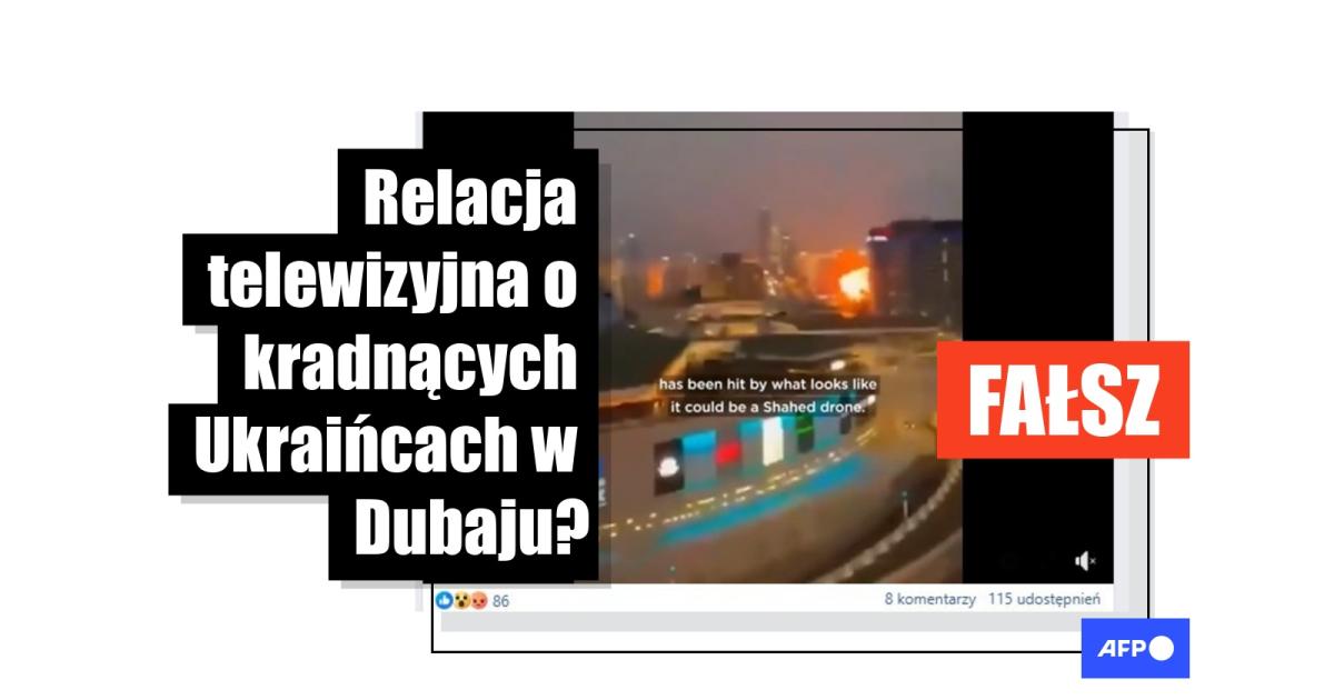 Po ataku Izraela i Stanów Zjednoczonych na Iran 28 lutego 2026 roku, Teheran w odwecie zaatakował miasta Zjednoczonych Emiratów Arabskich, w tym Dubaj, wystrzeliwując w jego kierunku drony i rakiety. W tym kontekście w polskich mediach społecznościowych zaczął krążyć film wyglądający na materiał informacyjny wraz z twierdzeniem, że grupy Ukraińców rabowały sklepy jubilerskie i kradły porzucane samochody w Dubaju. Przeprowadzona przez AFP weryfikacja wykazała jednak, że wideo podszywa się pod autentyczny materiał redakcji Euronews, a jego ścieżka dźwiękowa została przerobiona przy użyciu narzędzi sztucznej inteligencji. Dziennikarka stacji w oryginalnym materiale nie wypowiadała żadnych takich słów. Stacja również potwierdziła, że nagranie zostało zmanipulowane.