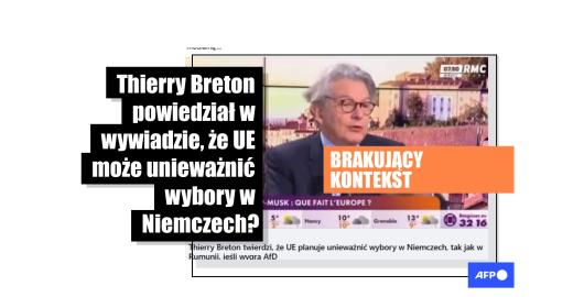 Obraz Unia Europejska Opublikowano 12/02/2025 UE nie może unieważnić wyborów: wypowiedź byłego komisarza UE Thierry’ego Bretona została błędnie zinterpretowana