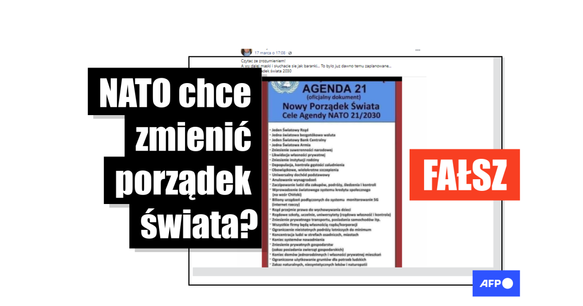 „A wy dalej maski i słuchacie się jak baranki... To było już dawno temu zaplanowane... Nowy porządek świata 2030” – czytamy w poście opublikowanym 17 marca 2021 roku. Podobne posty były popularne już w grudniu 2020 r. Publikacja prezentuje rzekomą listę celów dla Agendy NATO. Wśród nich wymieniono m.in. „zniesienie instytucji rodziny”, „obowiązkowe, wielokrotne szczepienia” czy „depopulacja”.