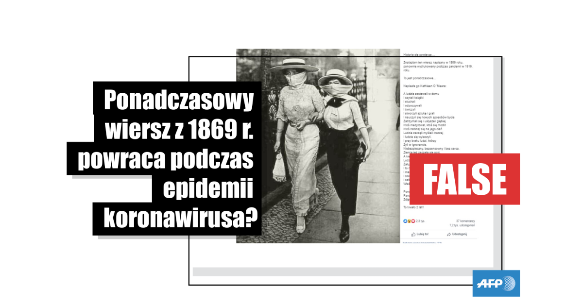Utwór razem z fotografią dwóch zamaskowanych kobiet pojawił się na Facebooku 17 maja i był udostępniany ponad 7 tys. razy. - Historia się powtarza - czytamy. - Znalazłam ten wiersz napisany w 1869 r, ponownie wydrukowany podczas pandemii w 1919 roku. To jest ponadczasowe - pisze użytkowniczka Facebooka.