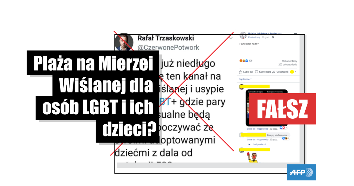 W mediach społecznościowych od kilku dni krąży obraźliwy dla osób LGBT i beneficjentów 500+ tweet prezydenta Warszawy. Trzaskowski miał rzekomo napisać, że w kanale na Mierzei Wiślanej zostanie usypana plaża, na której „pary homoseksualne będą mogły odpoczywać ze swoimi adoptowanymi dziećmi z dala od patologii 500+”.